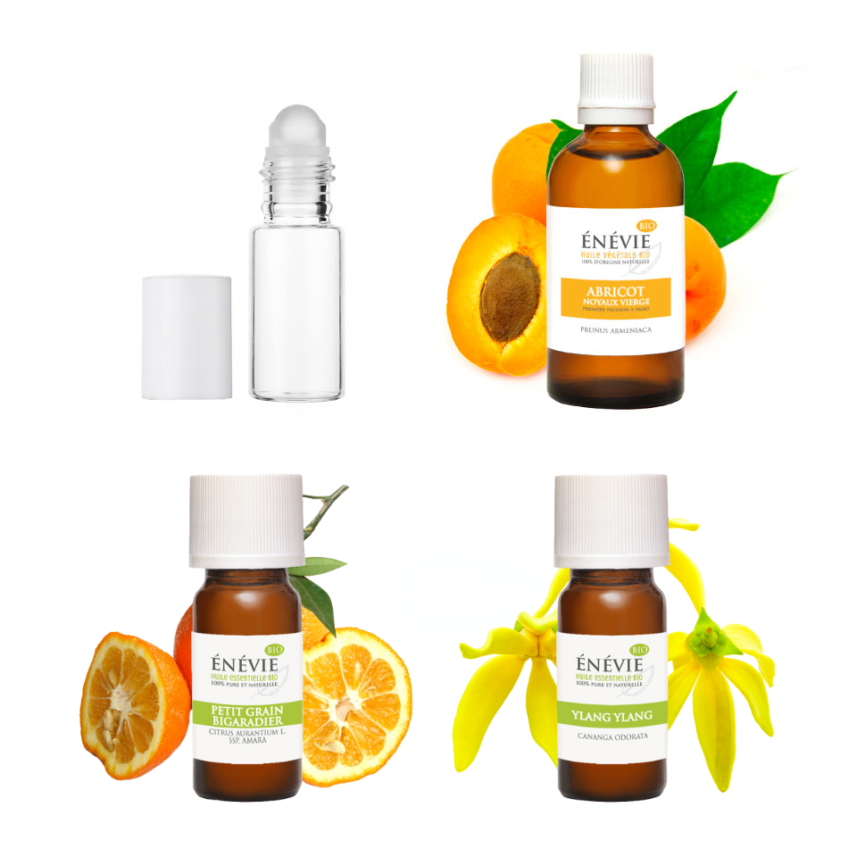 Dans le roll on 5 ml, ajoutez 35 gouttes de chaque huile essentielle et complétez le roll-on avec l’huile végétale de noyaux d’abricot.